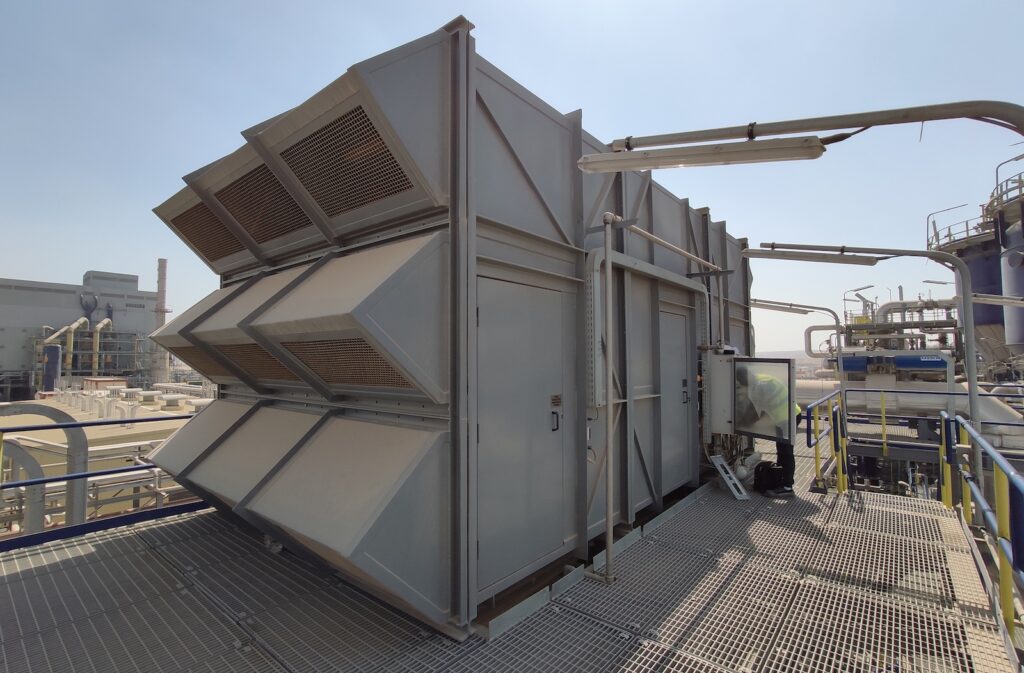 Unità di ventilazione insonorizzata comprendente 2 cabinati, con relativi silenziatori inlet, condotti di ventilazione e quadri di controllo installati nell’”Ain-Sokhna Phosphatic Fertilizer” in Egitto. Uno dei siti produttivi di fertilizzanti fosfati più importanti al
