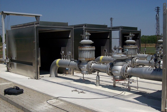 Campanas antideslizantes a prueba de ruido en la reducción del complejo de presión para las plantas de distribución de gas natural. Construcción completa de acero inoxidable. Certificado de acuerdo con la Directiva ATEX. Reducción de la presión acústica de 30 dB (A) sobre el ruido típico generado por el grupo de válvulas.