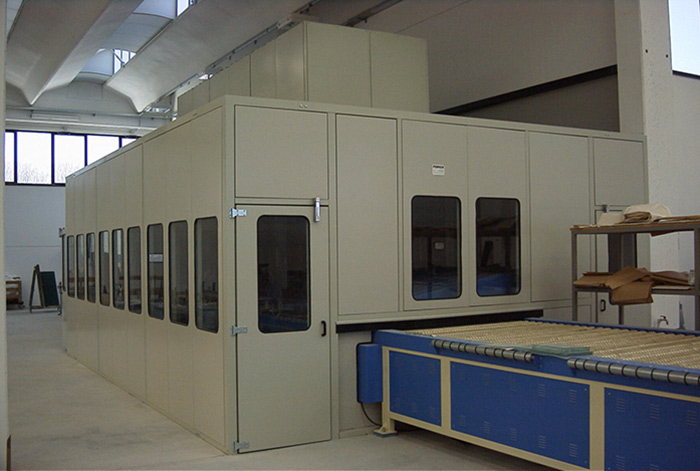 Gabinetes sobre endurecedor de vidrio. Máxima visibilidad a través de ventanas anchas. Gran silenciador de escape para la descarga de aire caliente por medio de la ventilación de tiro natural. Fácil acceso a través de las puertas completas del dispositivo de apriete automático para evitar fugas acústicas y de aire caliente.