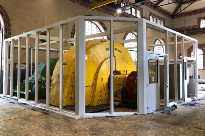 Cabina accesible y completamente desmontable, para facilitar el manejo de los componentes de la turbina en la histórica planta hidroeléctrica construida en 1932. Ventilada mediante un ventilador eléctrico acoplado a un silenciador.