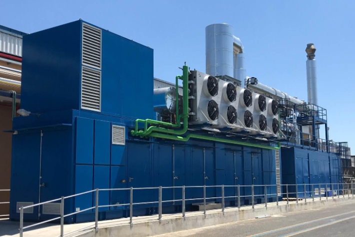 4 gabinetes instalados en la planta de energía Ferentino (FR). En el interior, un motor de 2.7 MW, una caldera de recuperación y un sistema de absorción.