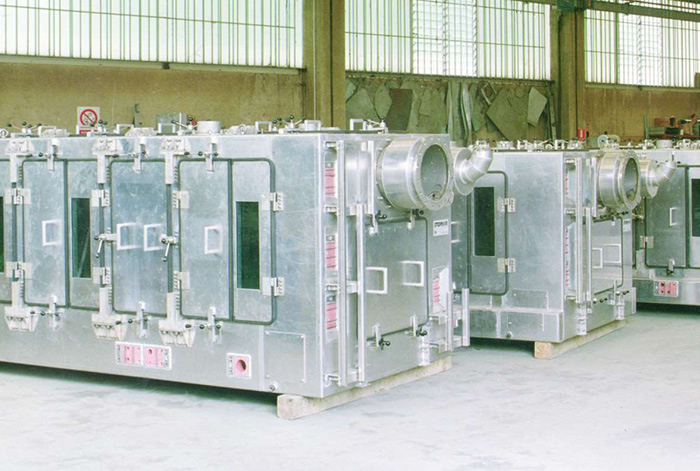 Gabinetes modulares para turbinas propulsoras de gas para transbordadores rápidos. Instalación sobre patines de turbina de gas mediante montaje especial anti-vibración. Aberturas para ventilación forzada. Puertas de acceso e inspección acristaladas en arbustos de bronce especiales. Nivel de presión acústica residual 92 dB (A) a 1 m de condición de campo libre.